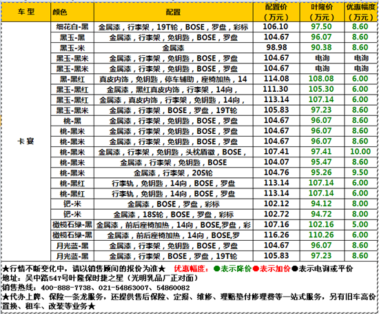 在西班牙語中,cayenne是“辣椒”的(de)意思,而這(zhè)款著名跑車生産廠家生産的(de)越野車無論是外在還(hái)是内在,也(yě)确實像一支火辣辣的(de)辣椒,吸引著(zhe)人(rén)們的(de)目光(guāng)。葉隆保時(shí)捷之星多(duō)款卡宴钜惠,帶你體會卡宴的(de)速度與激情。