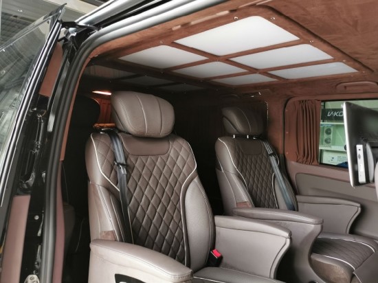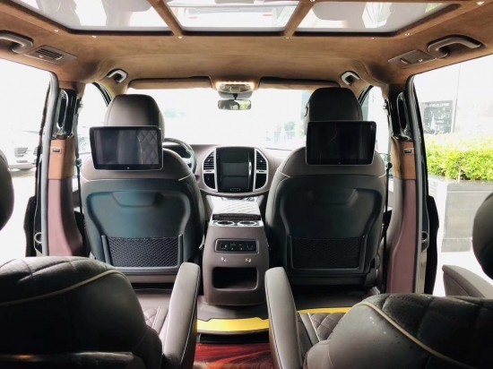 配置:方向盤半真皮半桃木(mù),儀表台包覆,加裝大(dà)屏導航,前門闆包覆,司副座椅包覆,司副座椅加裝頭枕屏,扶手箱含冰箱,司副座椅後加裝腳踏闆,駕駛室鋪超纖腳墊,中門包覆,後側壁包覆,側壁喇叭罩亮飾,尾門包覆,鋪印花地闆,棕色,地闆上層鋪透明(míng)保護墊,頂棚及ABCD柱包覆進口鹿皮絨,九宮格頂燈,冠潤電動座椅,通(tōng)風、加熱(rè)、按摩、旋轉、電動腳拖,帶豪華扶手,奔馳開關,後排電動沙發床,帶控制屏,手動窗(chuāng)簾,台灣款式,全車線路,全車塑料件改色,全車桃木(mù)及鋼琴漆裝飾,不鏽鋼踏闆,可(kě)拆卸活動桌闆,行李架,大(dà)燈總成,拉手鍍絡亮飾,前中網,鋁合金輪毂,更換包圍,增加外接充電功能,千斤頂,備胎,工具包,拖車鈎,杯托 56萬